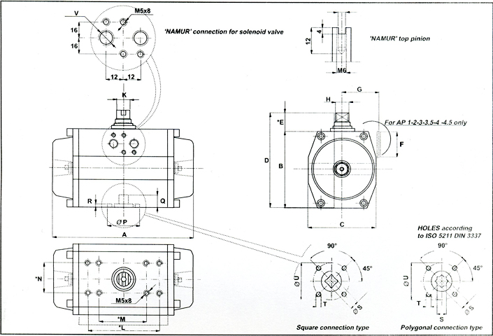 Connections : bottom drilling to match valve is in accordance with ISO 5211/DIN 3337 Interface for solenoid valve, shaft top end and top drilling to assemble accessories are in accordance with VDI / VDE 3845, NAMUR. |